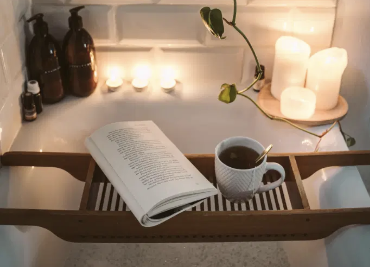 Even just playing nature sounds starts sending tingles down my spine and makes me feel like everything’s going to be okay. If you know what sounds or smells make you feel safe and comforted, fill your bathroom with them. If you don’t have a bathtub, a long shower does the trick too. The key is to slow down your thoughts and be present.